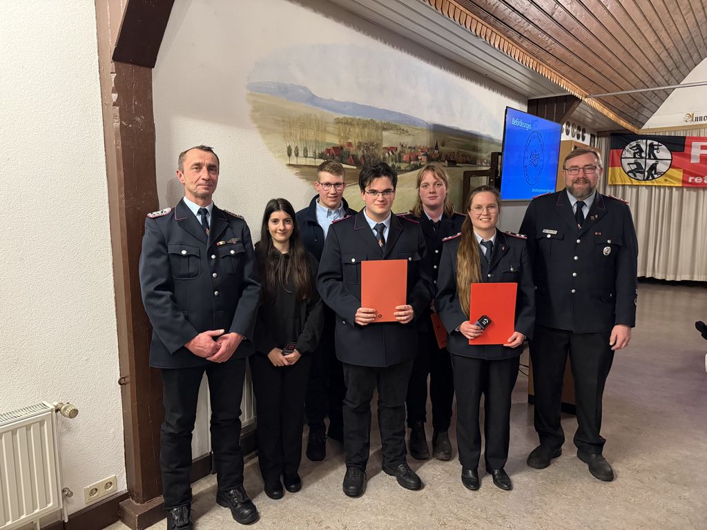 v.l.: Sven Bauch (stellv. Ortsbrandmeister), Dinye Acar, Mattes Köhsel, Ian Becker, Catharina Bick, Laura Becker, Tobias Metz (Ortsbrandmeister und stellv. Stadtbrandmeister). Foto: : Eric Bauer.