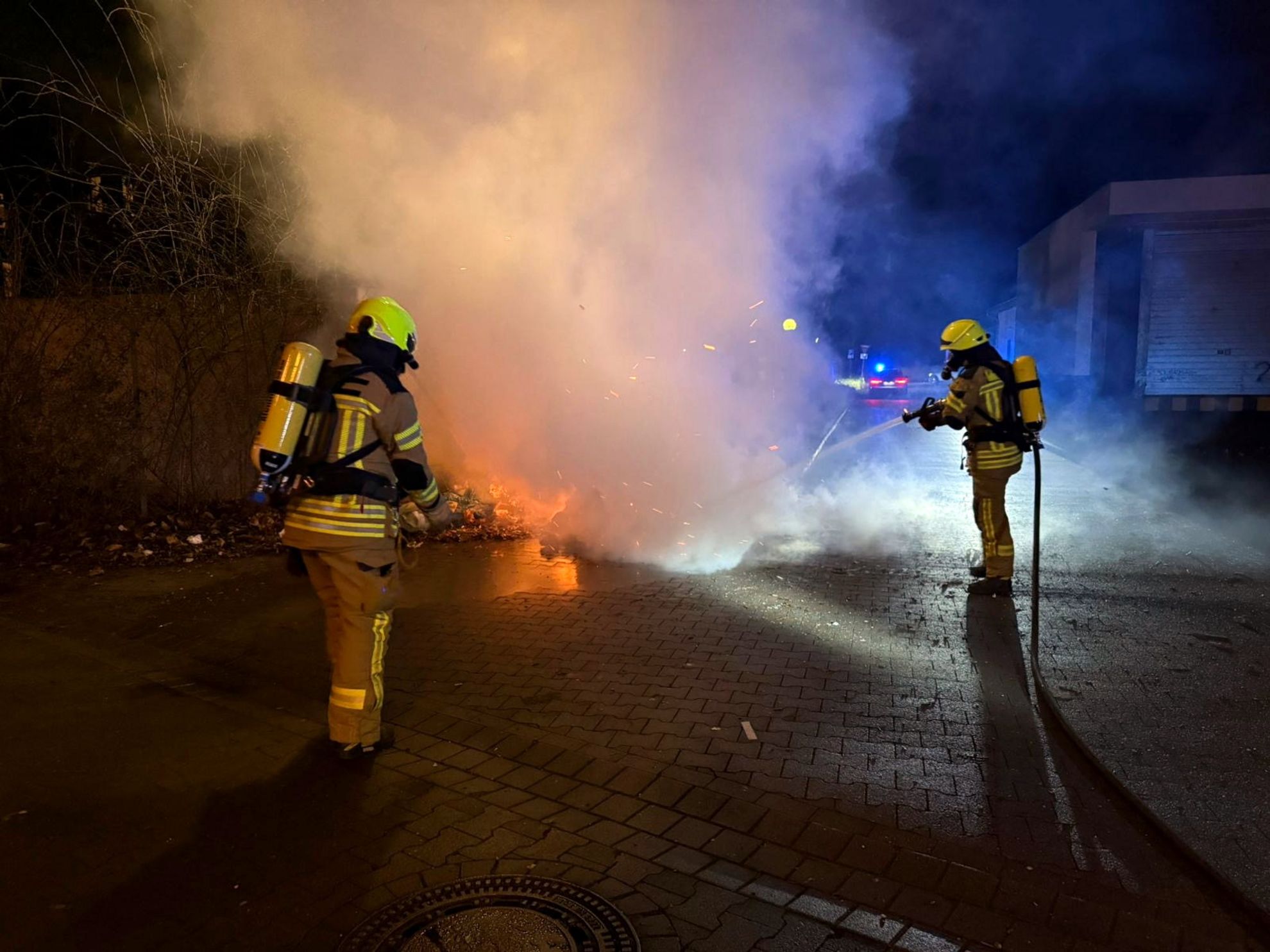 In den frühen Stunden des Neujahrstages folgten zwei weitere Einsätze im Bereich des Rewe-Supermarktes. Um 1.02 Uhr wurde zunächst ein unklarer Feuerschein gemeldet, der sich als brennender Container herausstellte und ebenfalls mit dem Schnellangriff gelöscht wurde. Um 3.49 Uhr brannte dort erneut ein Müllcontainer. Dieser konnte mit Kleinlöschgeräten rasch abgelöscht werden. Ortsbrandmeister Mark Etzrodt erklärte dazu augenzwinkernd: „Eigentlich sind die pinken Gießkannen aus Joke entstanden, weil wir immer viele Feuerwerksreste hatten, bei denen dann einfach der Eimer zum Einsatz kam. Dieses Jahr wurden extra die ‚Speziallöschgeräte‘ gekauft.“