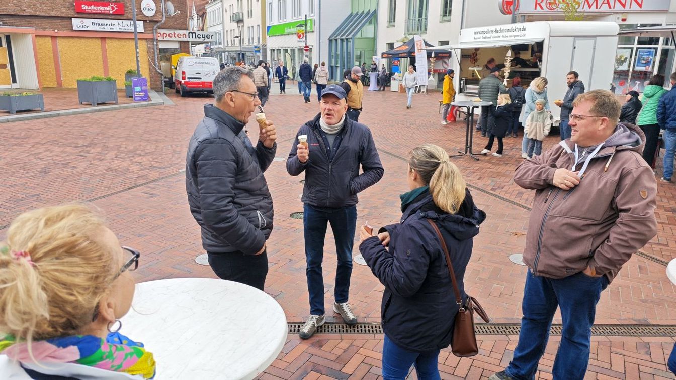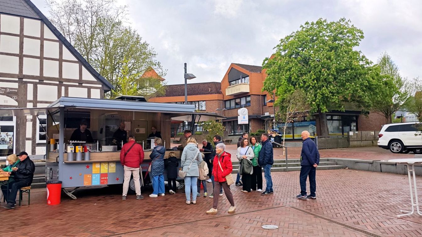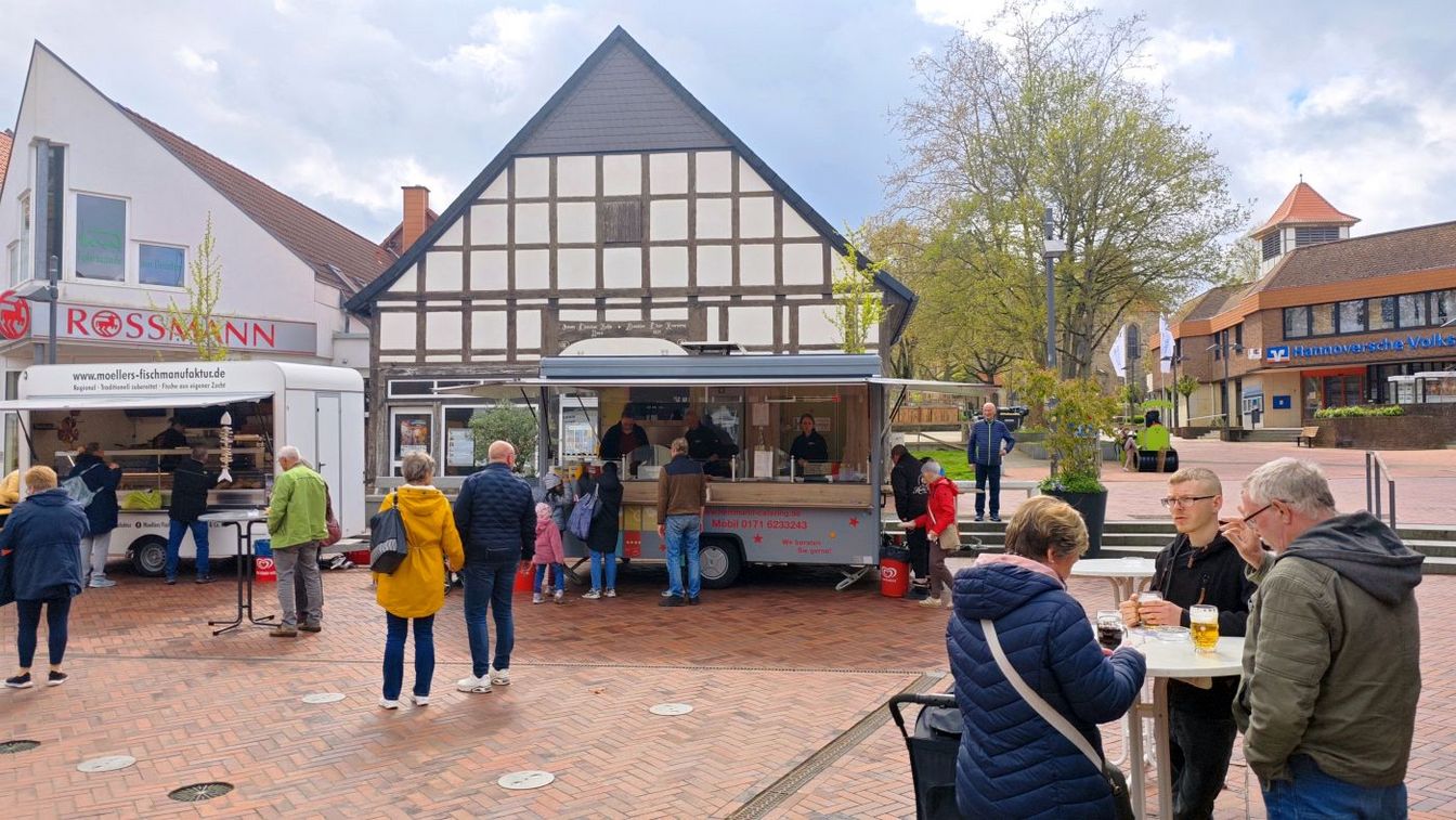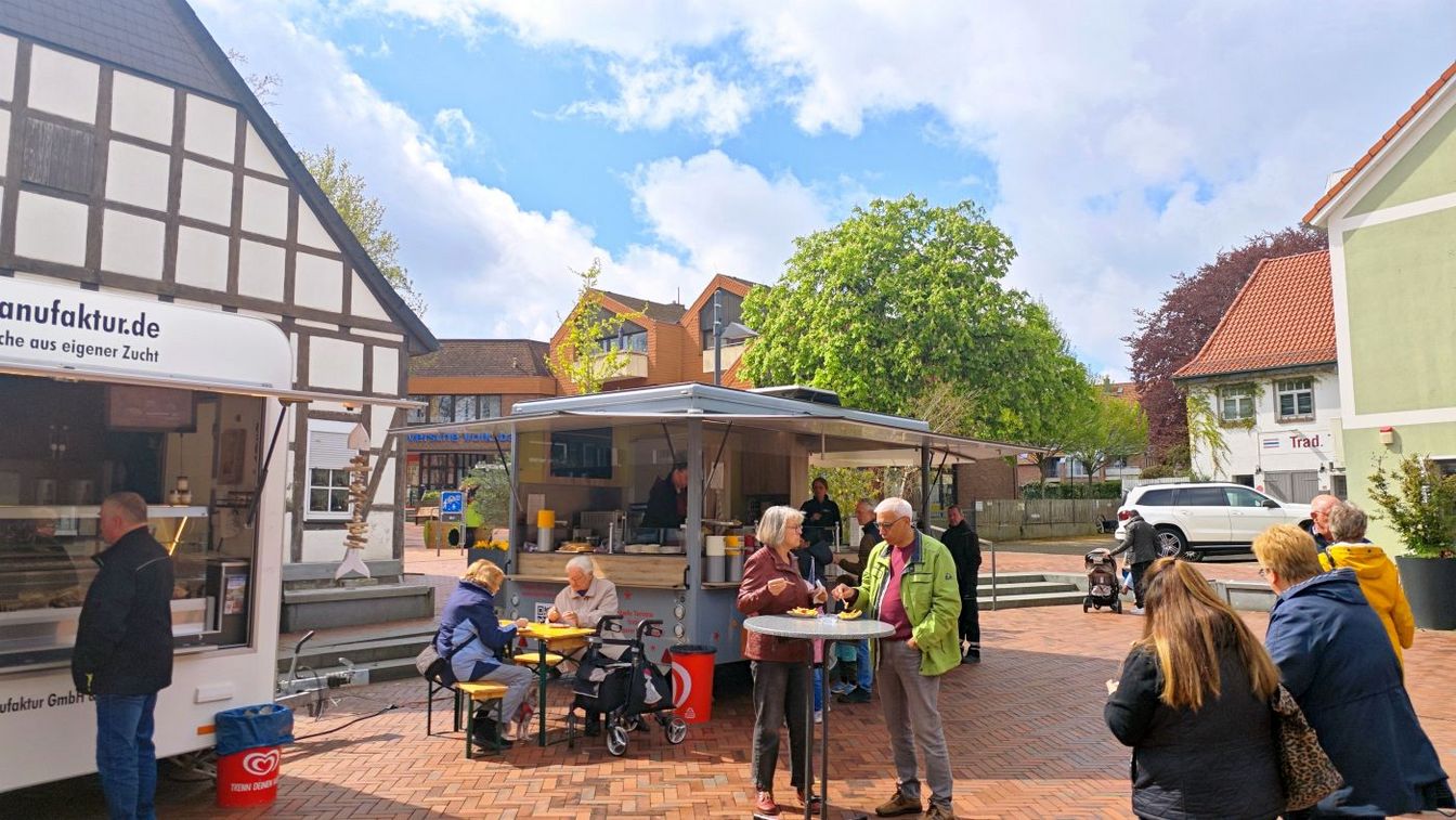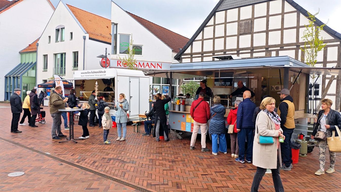 Neben dem Einkaufsbummel bietet das Frühlingserwachen auch kulinarisch eine große Auswahl. Verschiedene Stände mit Speisen und Getränken sind gut besucht – von klassischen Imbissangeboten bis hin zu Fischbrötchen. Auch Kaffee und selbstgebackener Kuchen laden zum Verweilen ein.