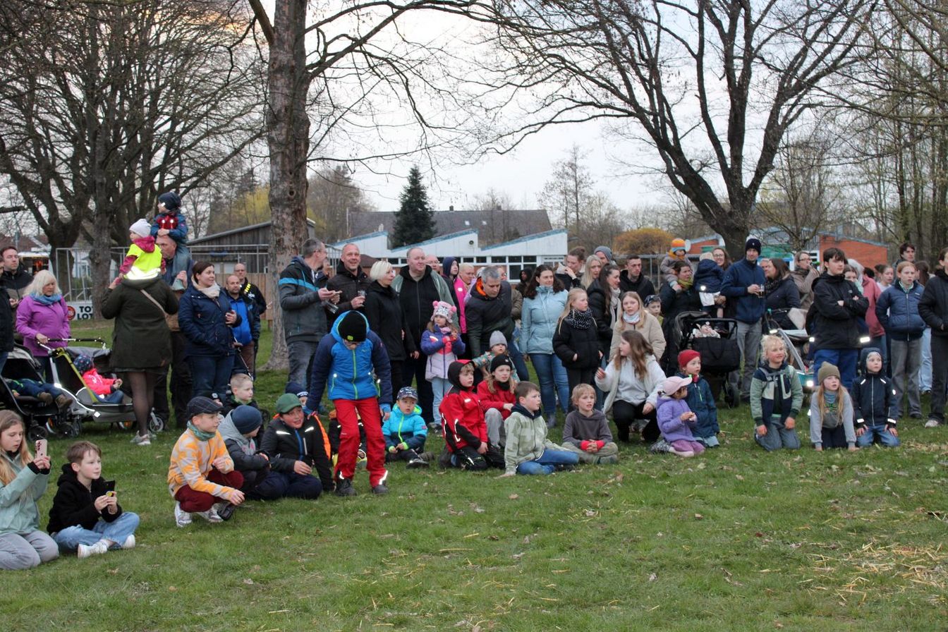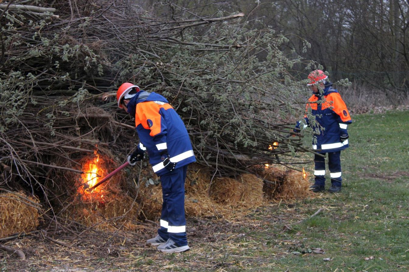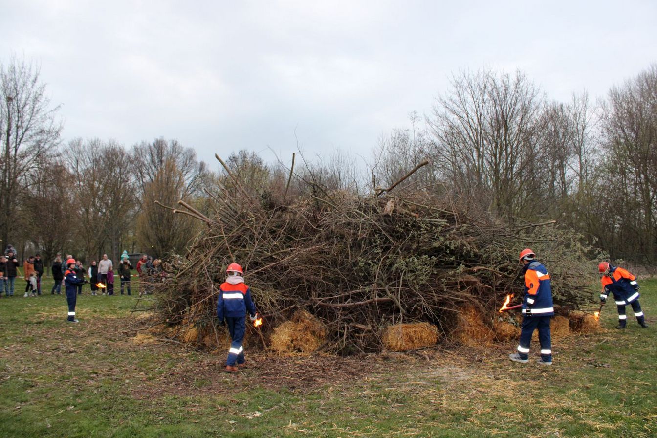 Während sich die Besucher um das aufgebaute Brenngut versammelten, entzündete die Jugendfeuerwehr ihre Fackeln und durfte erstmals das Feuer entfachen. Gegen 19.30 Uhr brannte das Osterfeuer schließlich.