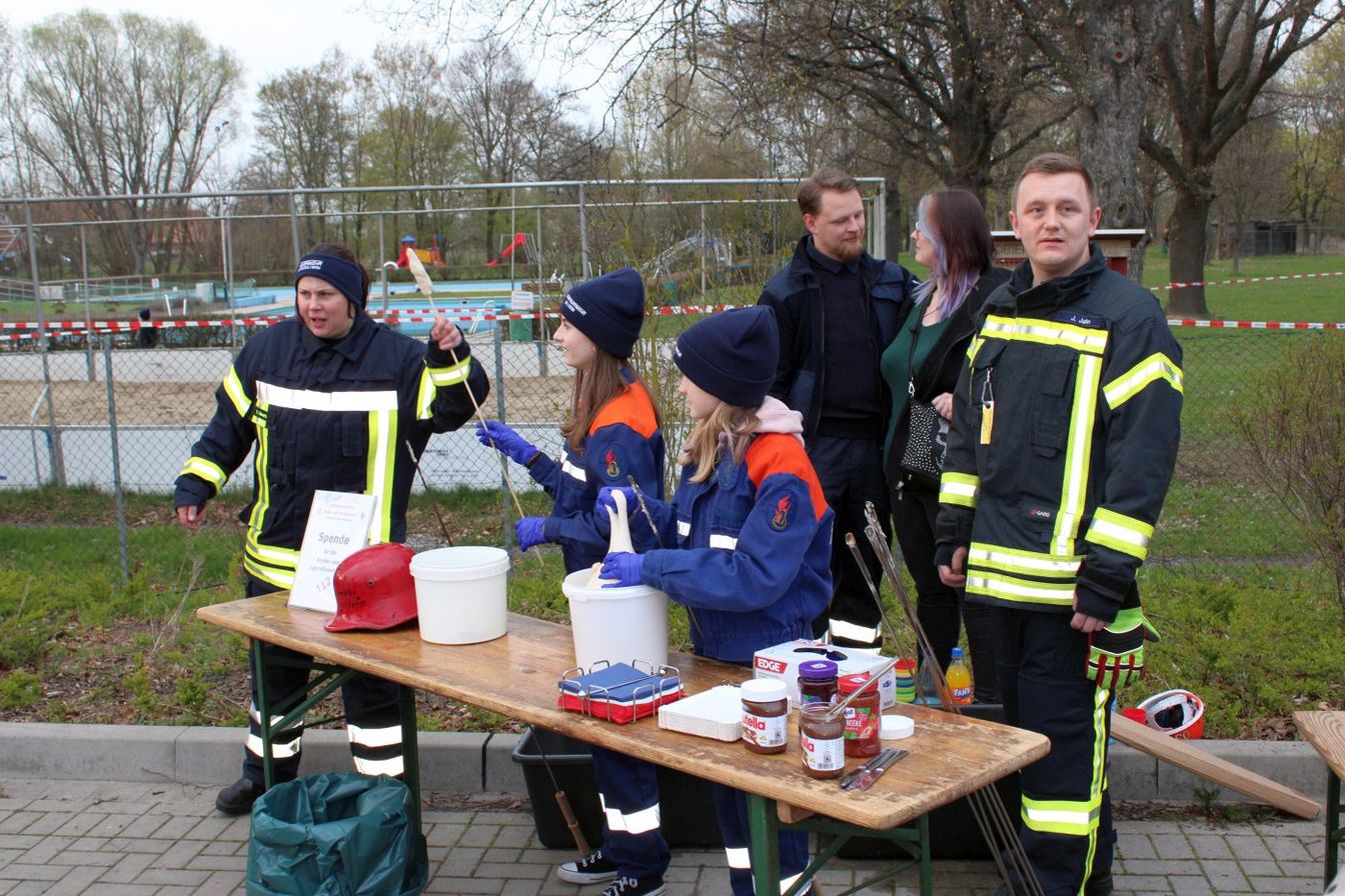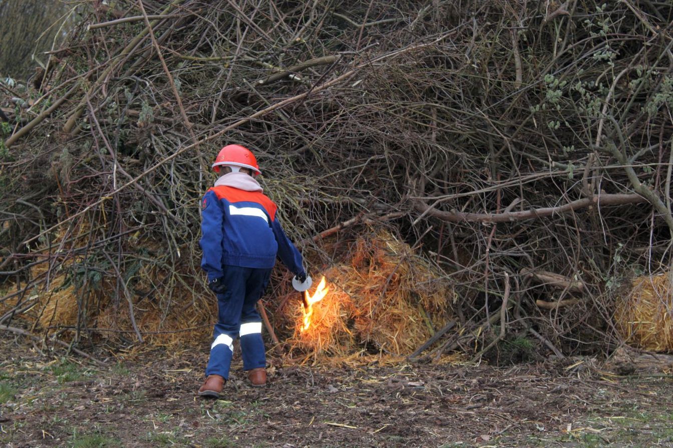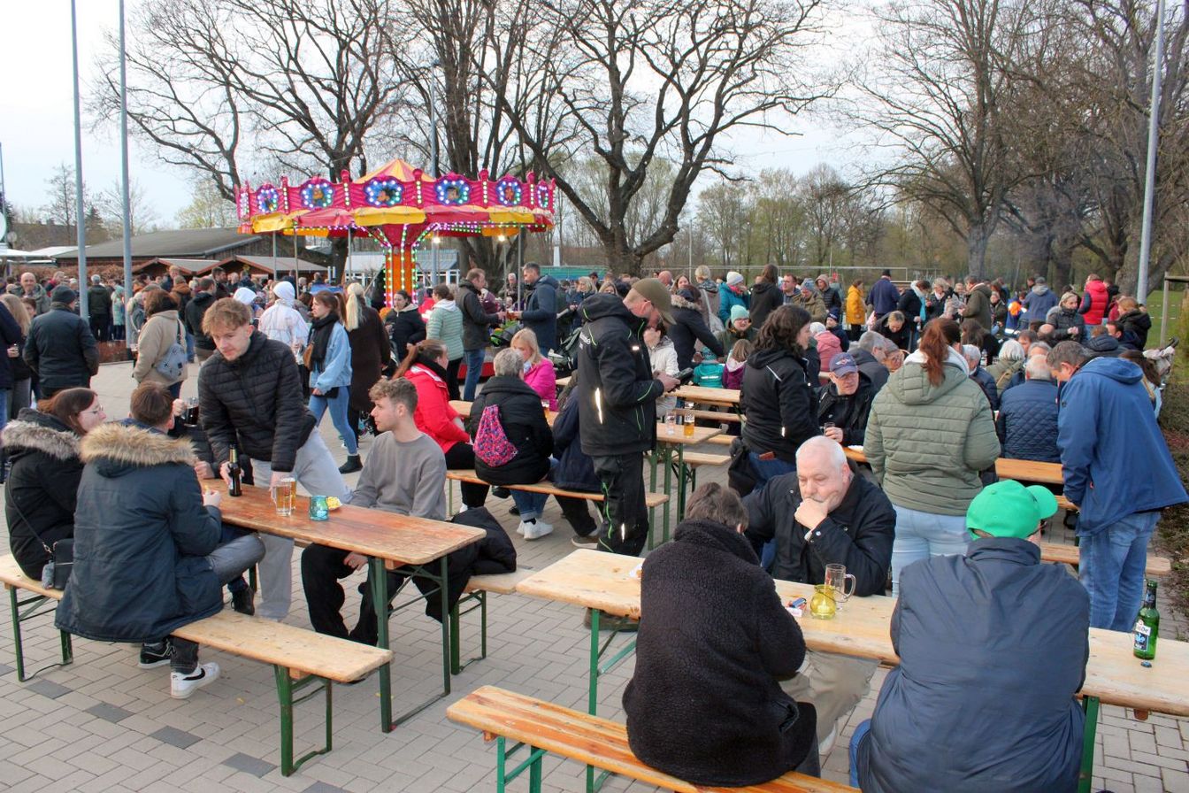 Während sich die Besucher um das aufgebaute Brenngut versammelten, entzündete die Jugendfeuerwehr ihre Fackeln und durfte erstmals das Feuer entfachen. Gegen 19.30 Uhr brannte das Osterfeuer schließlich.