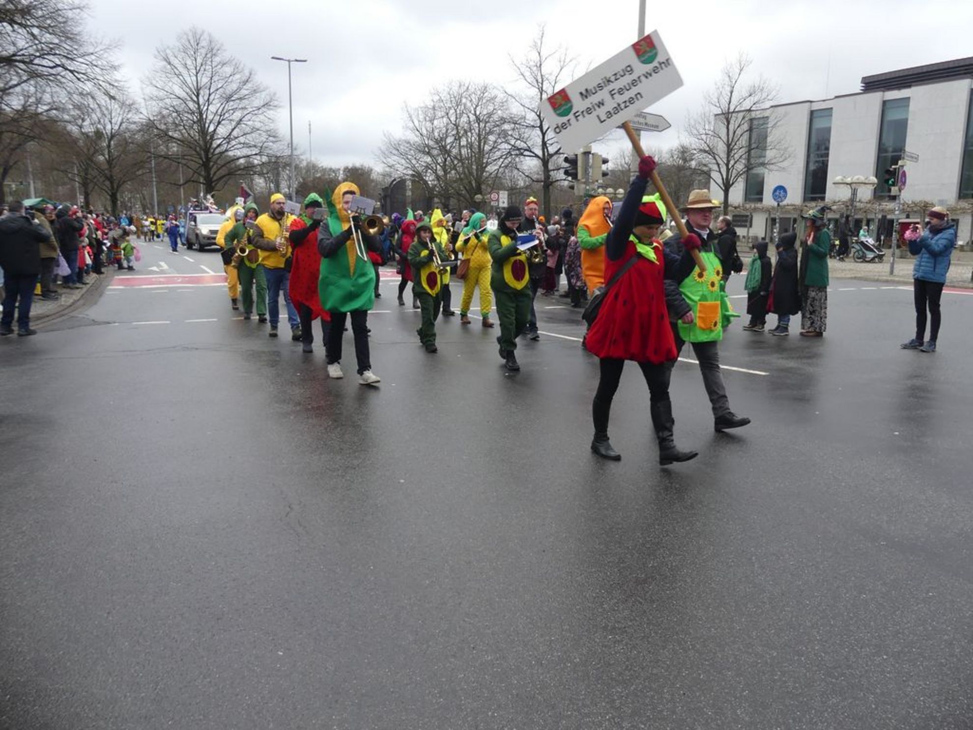 Nur das Wetter hätte besser sein können. Bei wenigen Grad über Null und bedecktem Himmel mussten sich die Laatzener immer wieder mit "kleinen Klopfern" innerlich wärmen. Wenn nicht ein Schild auf die Feuerwehrmusiker hingewiesen hätte, wären die Laatzener kaum als Feuerwehrmitglieder erkannt worden.  Alle hatten sich als Obst bzw. Gemüse kostümiert. Mehrere Erdbeeren, eine Banane, Avocado, Erbse, Zitrone, Chilli und der Dirigent als Gärtnermeister vorweg. Wie schon im letzten Jahr sorgten die Kostüme für einen "Hingucker" bei den zahlreichen Zuschauern, die die Strecke säumten. Von der Culemannstraße kommend,  an der Markthalle entlang zog sich die "bunte Schlange" aus Musikgruppen, Narren und Festwagen durch die Innenstadt.  Zugende war dann am Brauhaus in der Schmiedestraße, dort wurde dann natürlich noch weiter gefeiert.