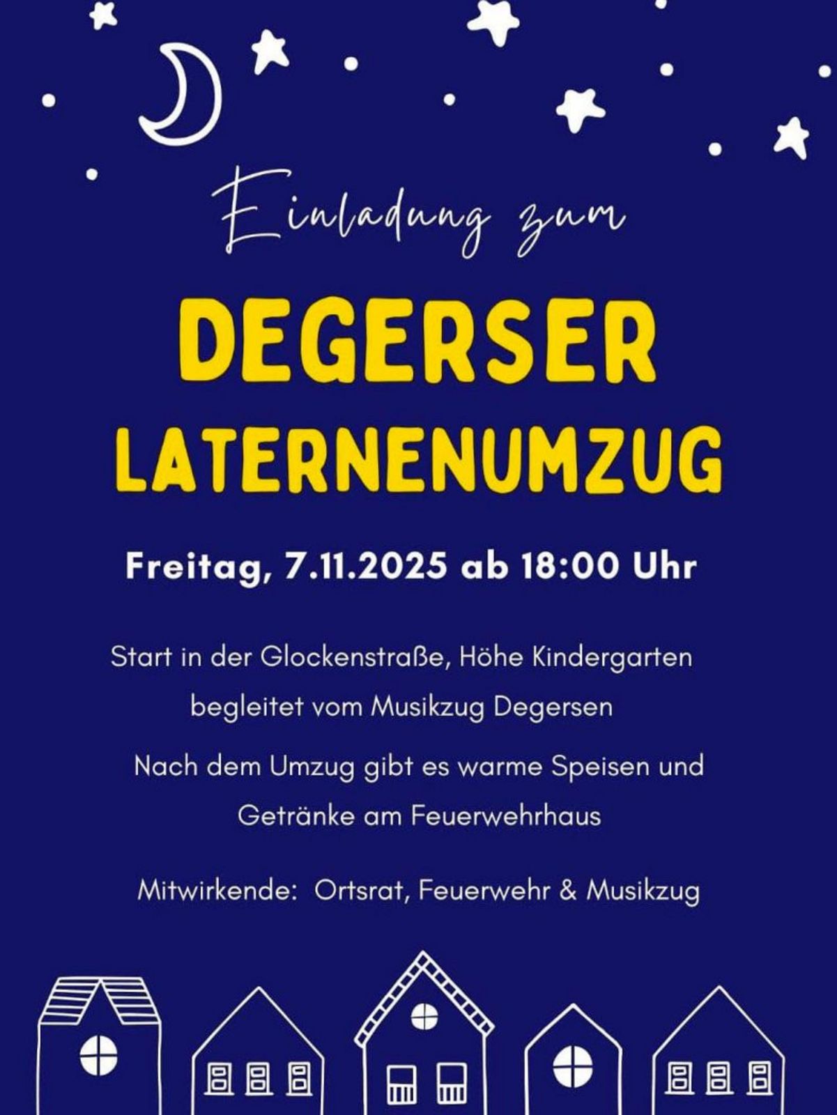 Degersen. Am Freitag, 7. November 2025, heißt es wieder: Laternen an und mitsingen! Ab 18:00 Uhr startet der stimmungsvolle Laternenumzug in Degersen in der Glockenstraße (Höhe Kindergarten). Begleitet wird der Umzug vom Musikzug Degersen, der mit bekannten Laternenliedern für die passende Atmosphäre sorgt.