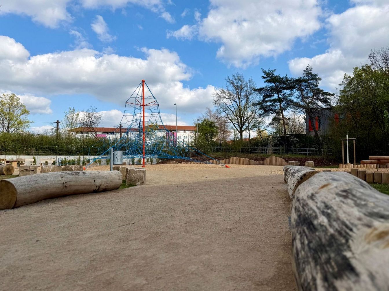 Herzstück ist eine rund 7,2 Meter hohe Seilpyramide in Orange und Blau. Ergänzt wird sie durch eine Mikado-Wippe und einen Balancierbalken, die zum Ausprobieren und Austoben einladen. Auch für ruhigere Momente ist gesorgt: Holzbänke, Baumstämme und Natursteine bieten Platz zum Sitzen und Treffen. Zwei junge Hainbuchen und zahlreiche Haselnuss-Sträucher begrünen das neu gestaltete Gelände. Niedrige Umrandungen aus senkrecht gesetzten Holzstämmen fassen die unterschiedlichen Spielbereiche der Anlage ein.