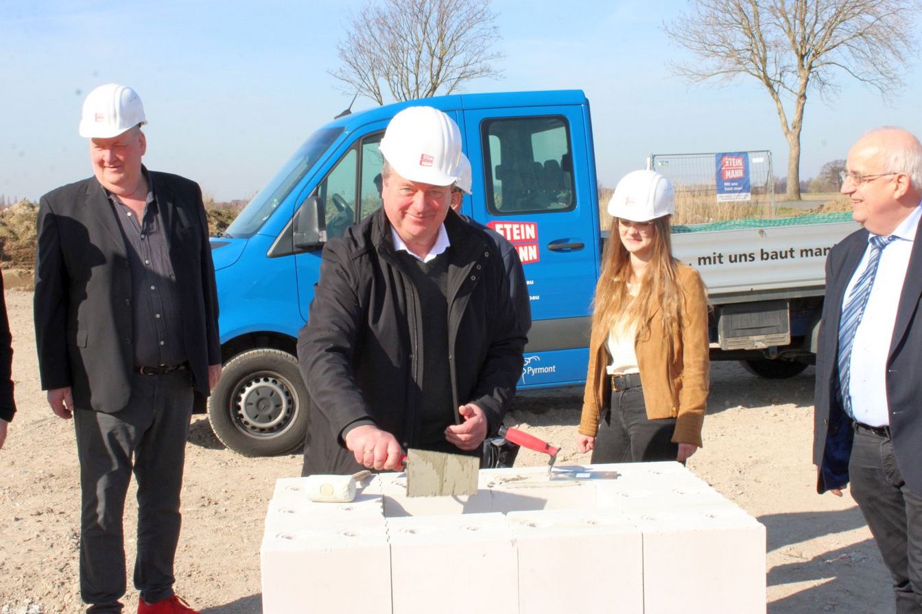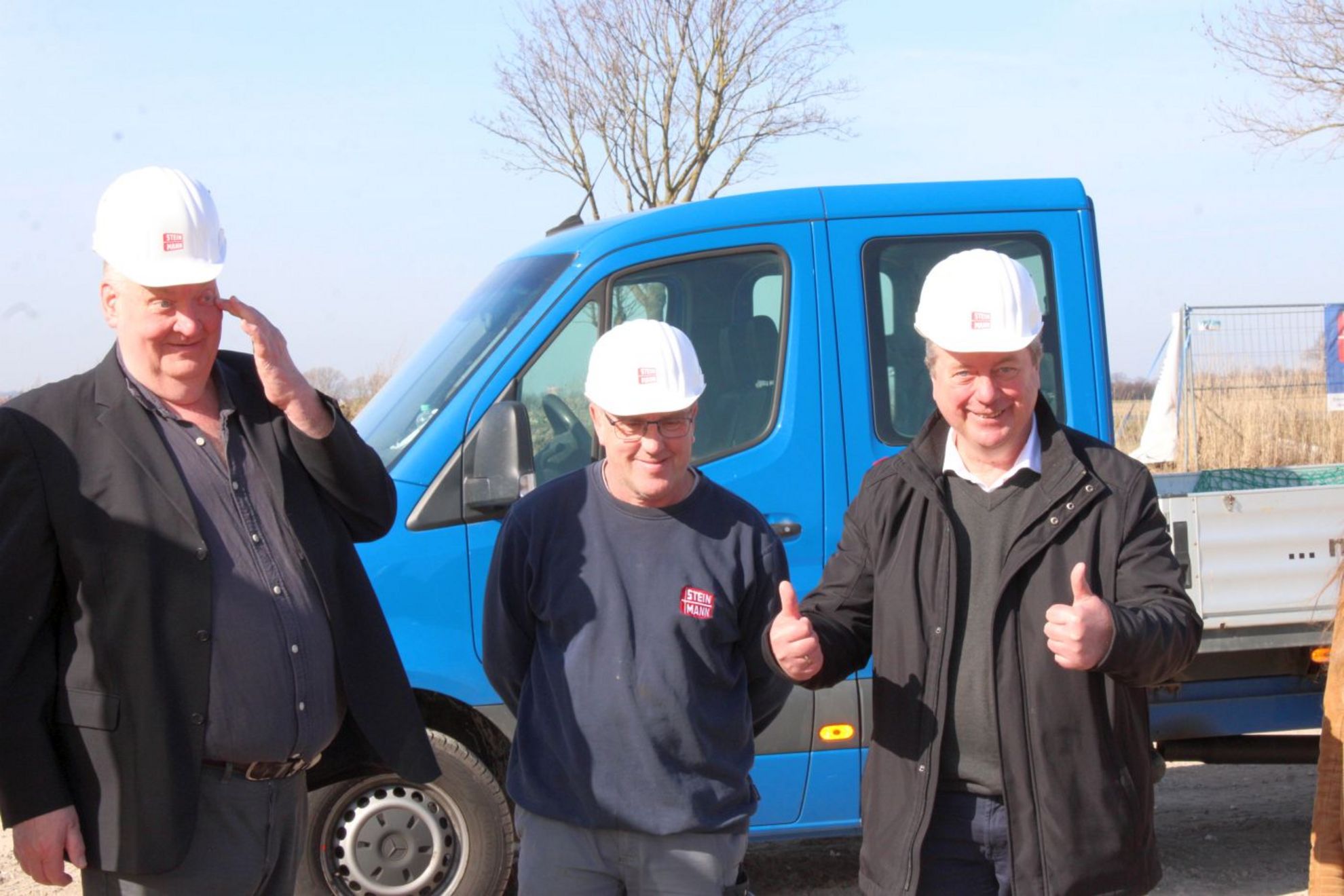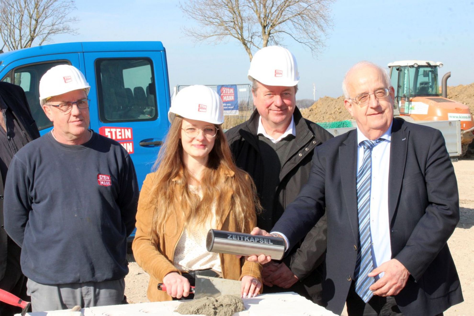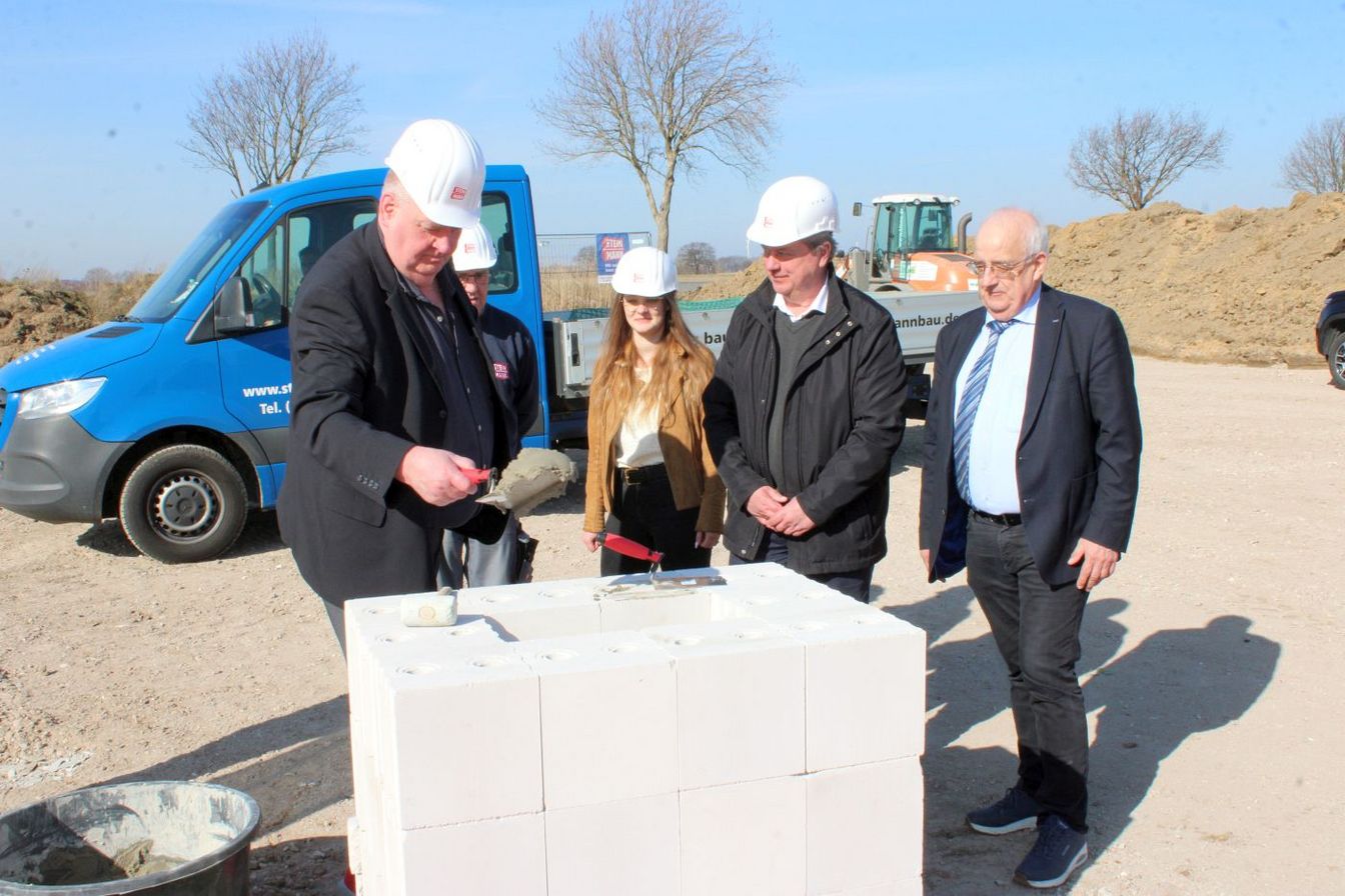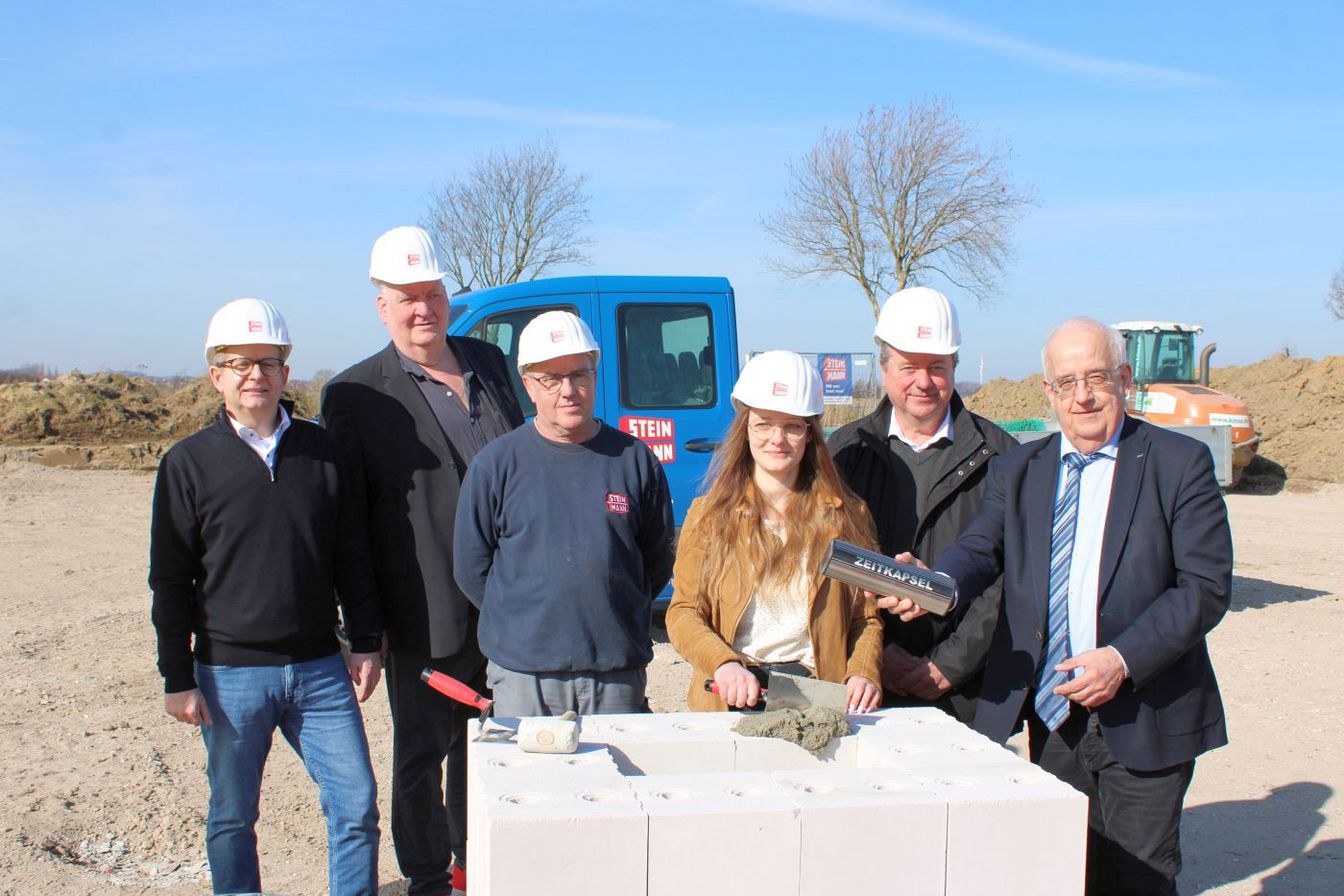 Grundsteinlegung bei Sonnenschein: (v.l.) Oliver Isenbart (Inhaber Baufirma), ASB-Geschäftsführer Jens Meier, Polier Ralf Kühl, Architektin Adelaida Braun, Bürgermeister Henning Schünhof und der ASB-Vorsitzende Friedbert Mordfeld.