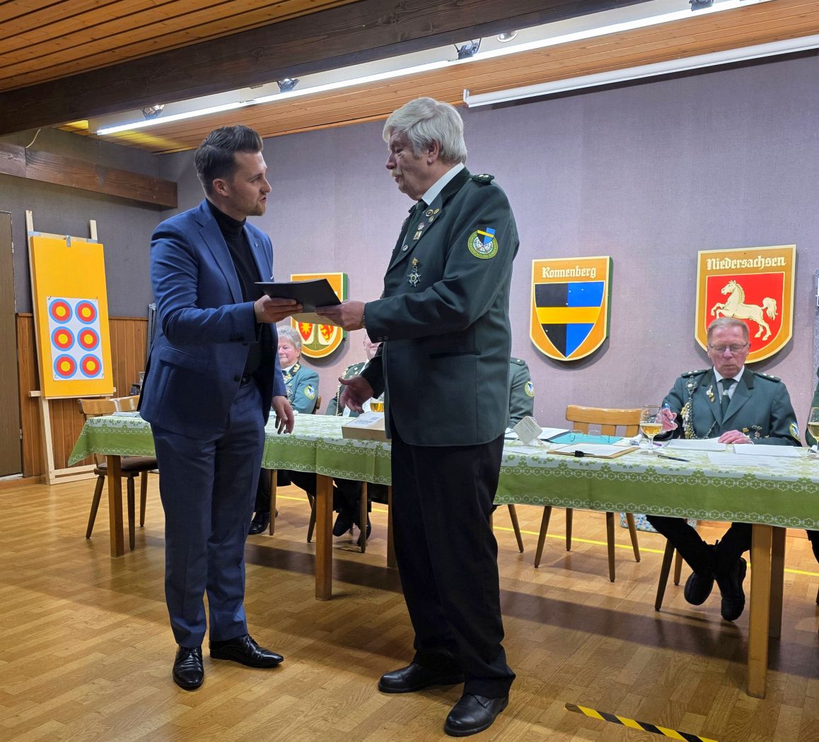 Zu den Gästen des Abends zählte Bürgermeister Marlo Kratzke, der ein Grußwort an die Anwesenden richtete. Dabei würdigte er das Engagement der Schützenvereinigung für das Vereinsleben und den gesellschaftlichen Zusammenhalt in Ronnenberg. Als Zeichen der Anerkennung überreichte er dem Vorsitzenden Claus Kunath ein Präsent.