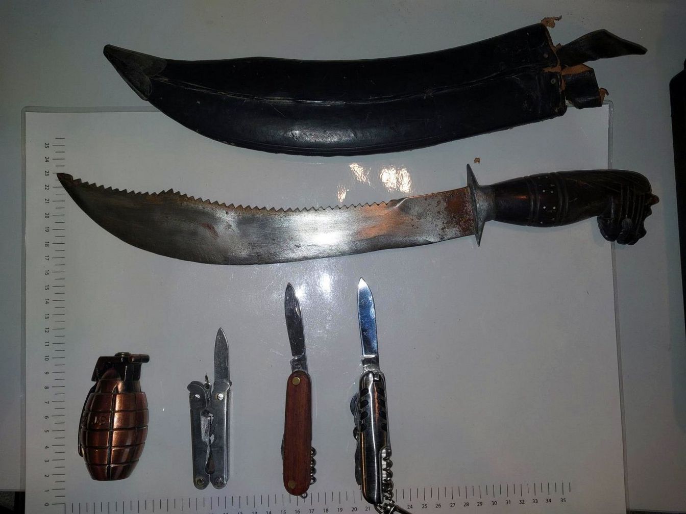 Bei der Durchsuchung seiner mitgeführten Gegenstände entdeckten die Beamten eine Machete sowie zwei Messer, ein Feuerzeug in Form einer Handgranate und ein Multitool auf. Das Mitführen dieser Gegenstände stellt einen Verstoß gegen die geltende Waffenverbotszone und die Allgemeinverfügung zum Mitführverbot von Waffen und gefährlichen Gegenständen dar. Die aufgefundenen Sachen sowie das Fahrrad wurden umgehend sichergestellt.