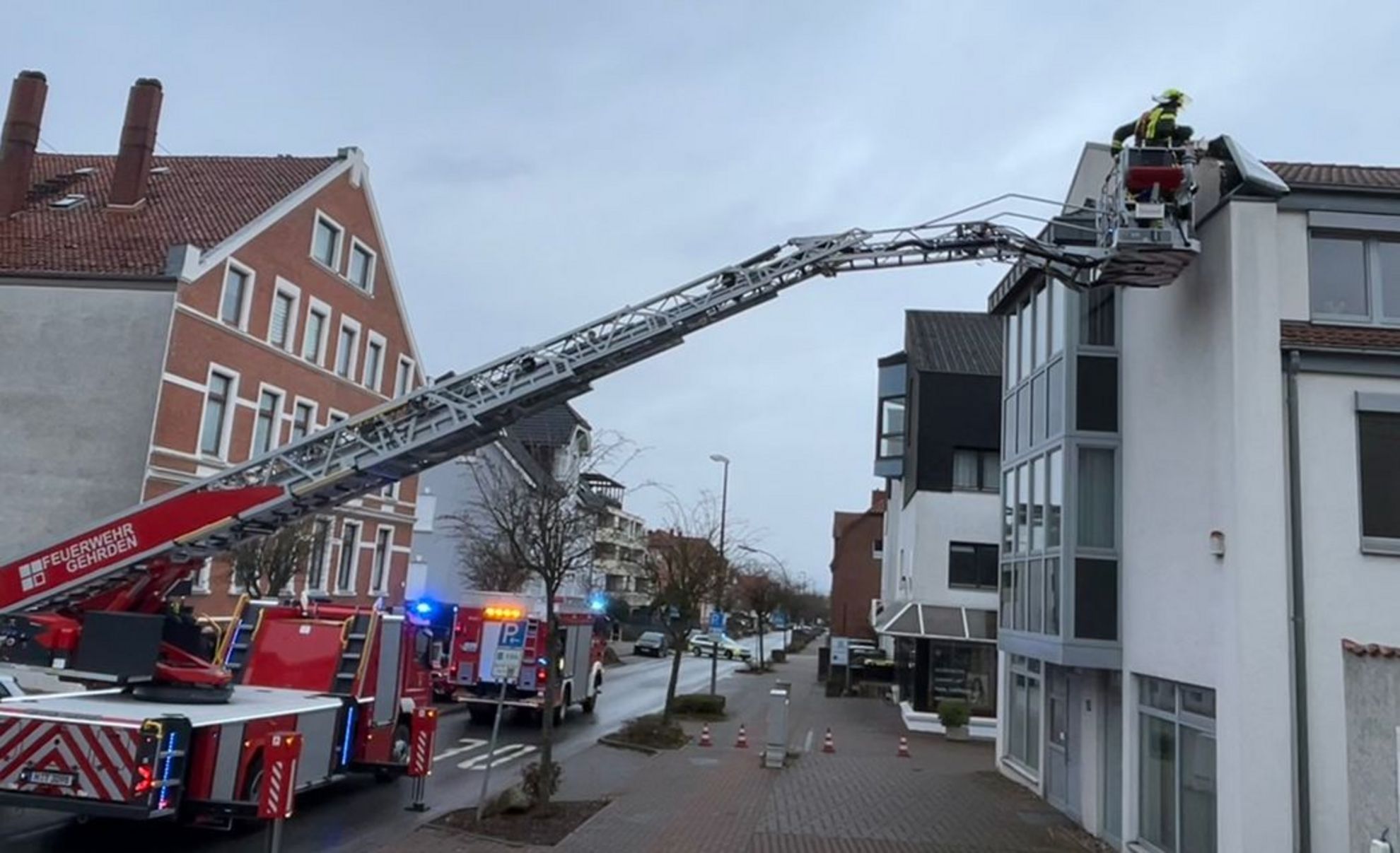 Der aufwendigste Einsatz folgte am frühen Nachmittag in der Gartenstraße. An einem Geschäftshaus hatten sich Blechverkleidungen am Giebel gelöst und stellten eine akute Gefahr für Passanten und den Verkehr dar. Aus dem Korb der Drehleiter trennten die Einsatzkräfte die Bleche ab, seilten sie kontrolliert zu Boden und beseitigten so die Gefahrenstelle vollständig. Während der Arbeiten musste die Straße gesperrt werden, was auch Auswirkungen auf den Busverkehr hatte.
