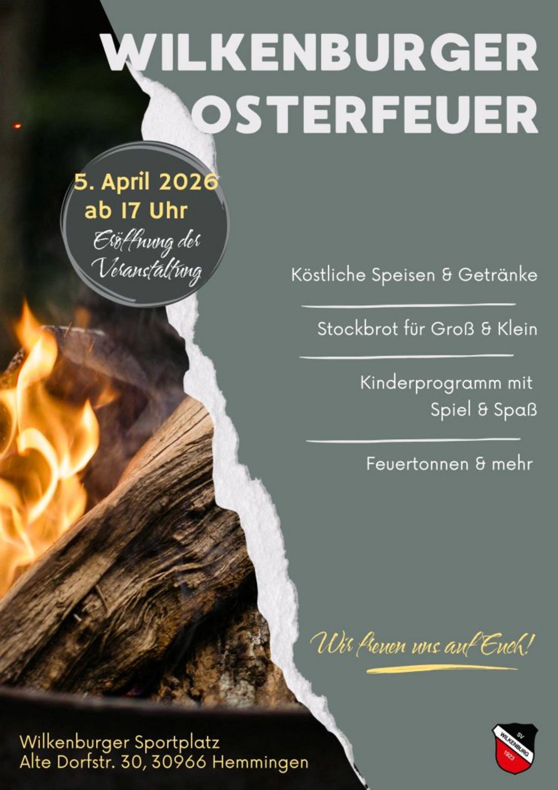Wilkenburg. Der SV Wilkenburg lädt am Ostersonntag, 05. April, ab 17 Uhr auf seine Sportanlage Alte Dorfstraße 30 in Wilkenburg zum Osterfeuer ein.