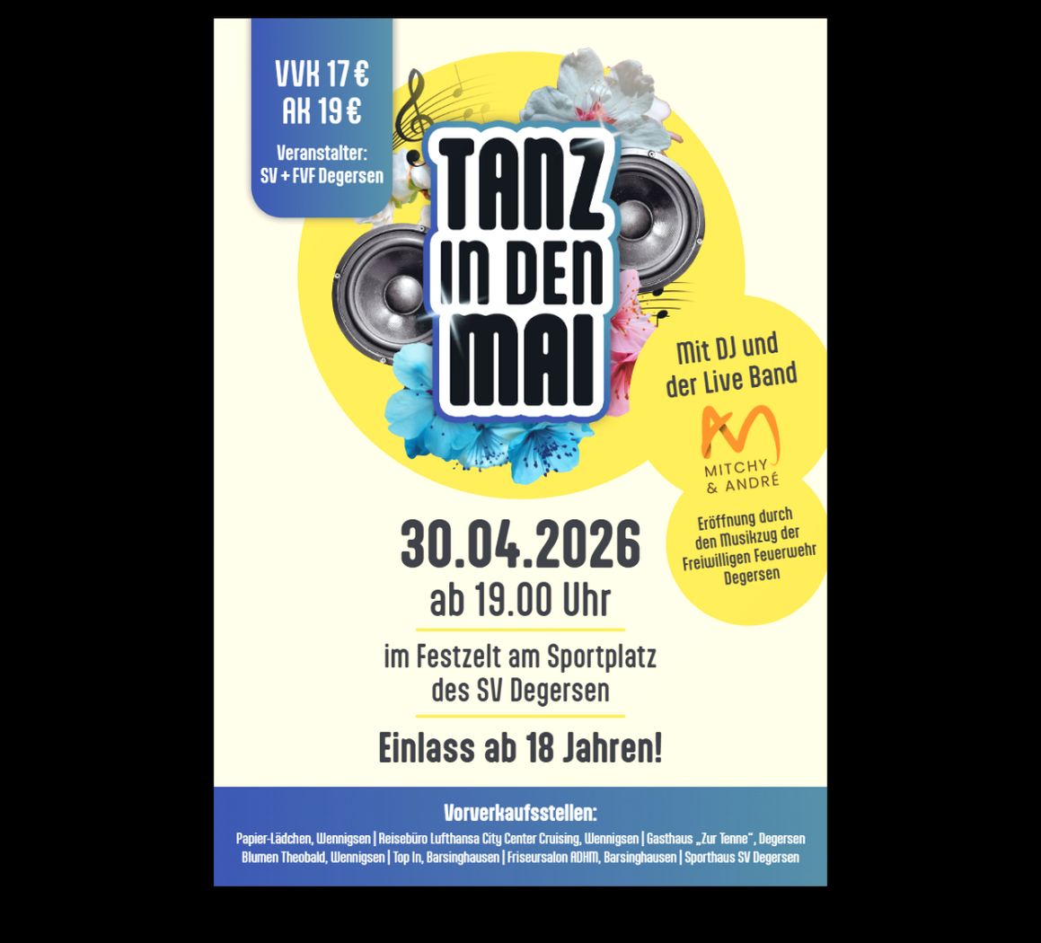Degersen. Wenn der SV Degersen zum „Tanz in den Mai“ einlädt, wird Degersen traditionell zum Anziehungspunkt für Feierfreudige aus der gesamten Region. Auch 2026 verwandelt sich das Festzelt vor dem Sportplatz in der Nacht vom 30. April auf den 1. Mai wieder in eine große Partyzone.