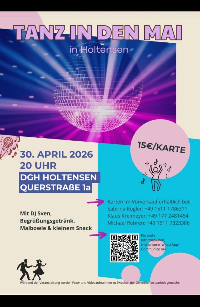 Holtensen. Der Frühling wird in Holtensen traditionell mit Musik und guter Stimmung begrüßt: Am Mittwoch, 30. April 2026, lädt die Veranstaltung „Tanz in den Mai“ ins Dorfgemeinschaftshaus (DGH) in der Querstraße 1a ein.