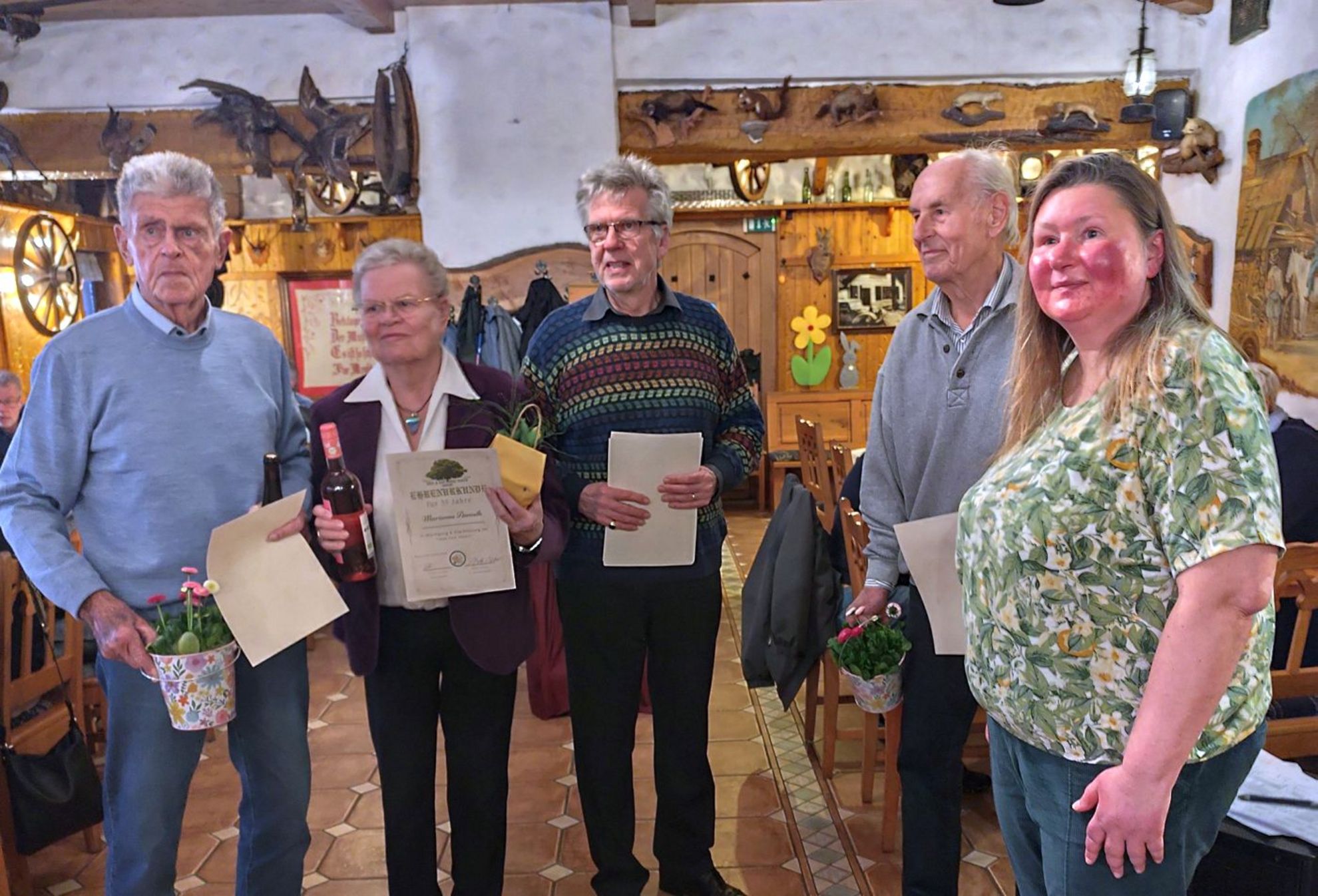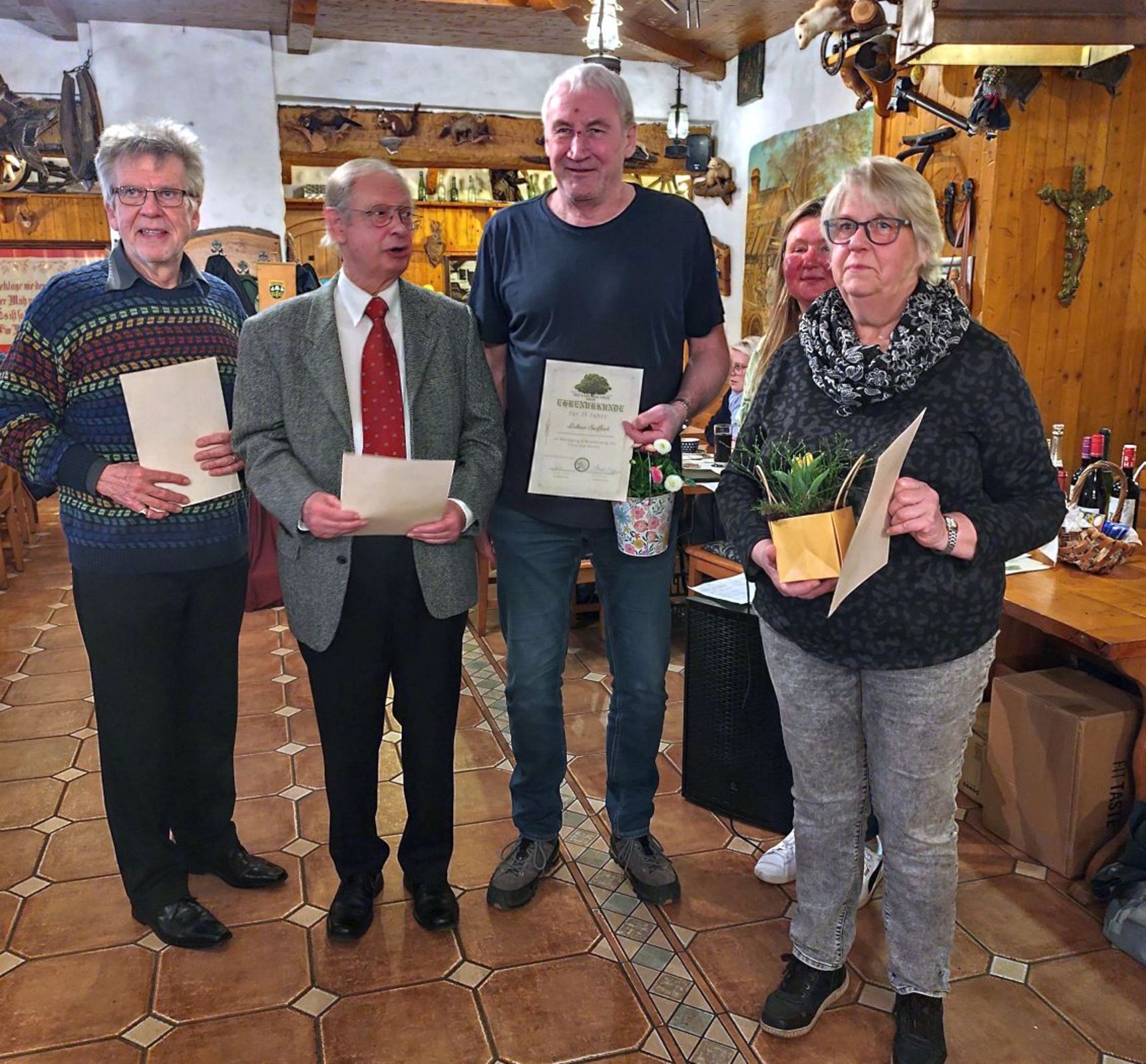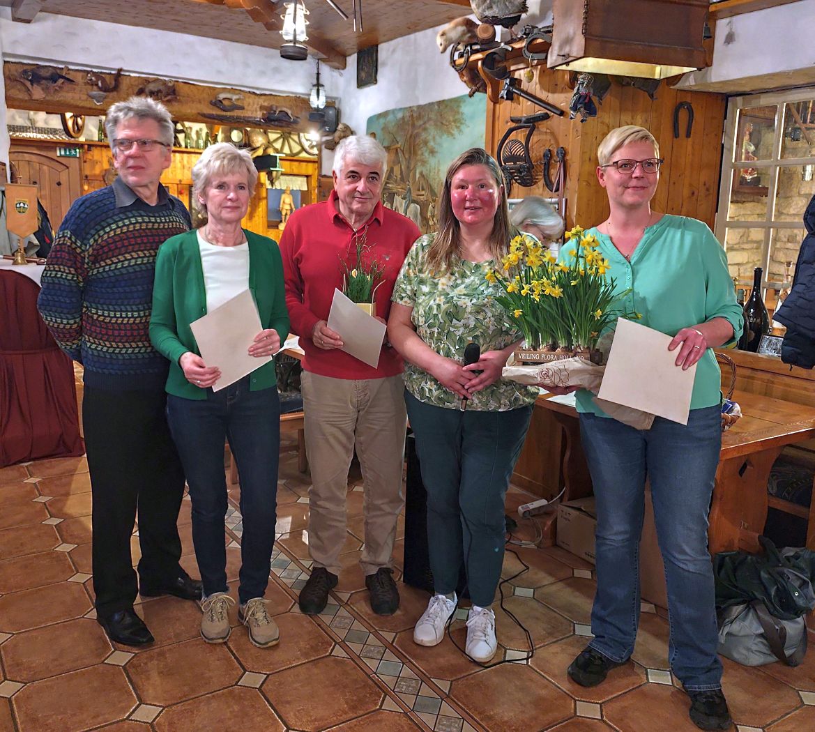 Ein wichtiger Punkt der Tagesordnung waren die Ehrungen. Der Vorstand hatte beschlossen, Mitglieder auszuzeichnen, die dem Verein über viele Jahre hinweg die Treue gehalten haben. Sie erhielten eine Ehrenurkunde, eine Flasche Wein und einen Blumenstrauß.