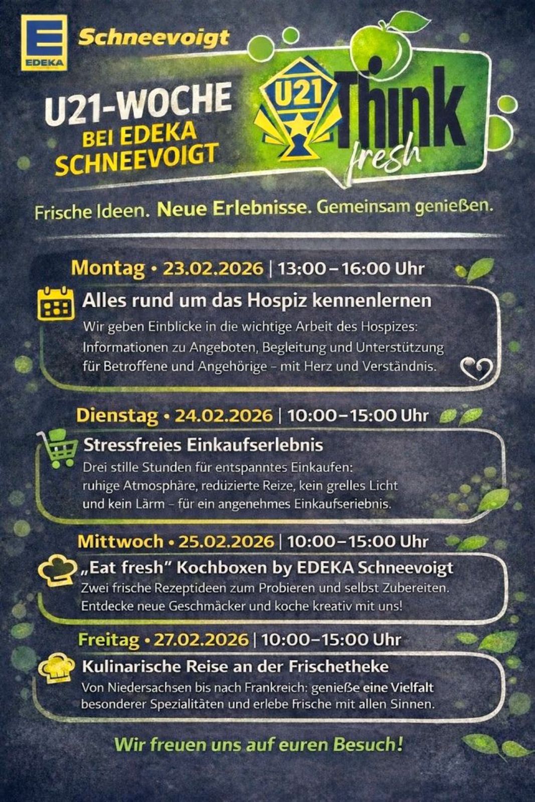 Egestorf. Die Auszubildenden von EDEKA Schneevoigt beteiligen sich erneut an der bundesweiten U21-Challenge – und haben dafür ein umfangreiches Wochenprogramm auf die Beine gestellt. Unter dem Motto „U21-Think fresh, von der Ware bis zum Menschen“ stehen Nachhaltigkeit, Kreativität und soziales Engagement im Mittelpunkt.