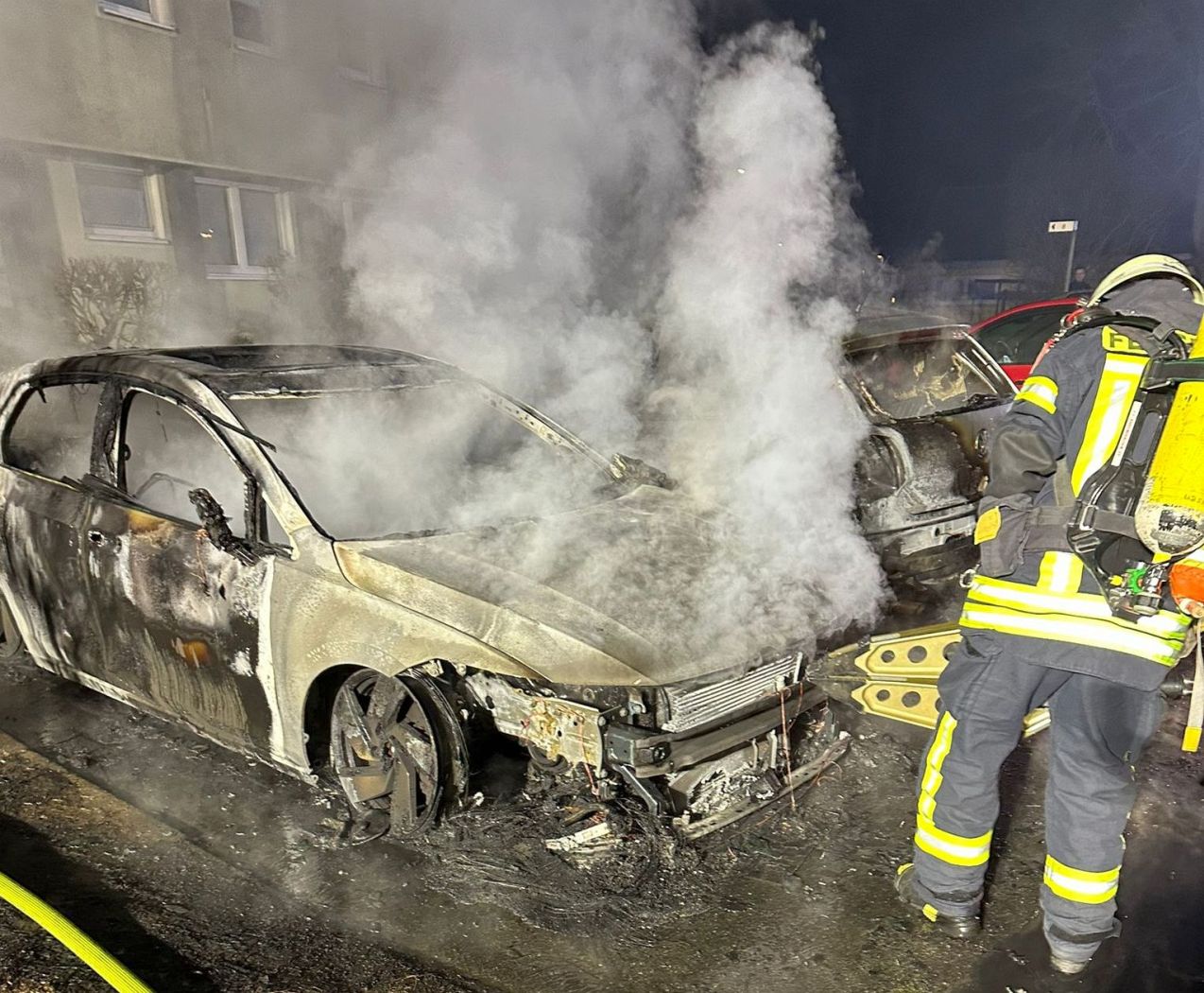 Barsinghausen. Am Dienstag, 10. März, wurden die Ortsfeuerwehren Barsinghausen und Kirchdorf um 04.24 Uhr zu einem Pkw-Brand in die Goethestraße alarmiert. Beim Eintreffen der Einsatzkräfte stand ein Pkw bereits in Vollbrand. Ein daneben abgestelltes Fahrzeug hatte ebenfalls Feuer gefangen.