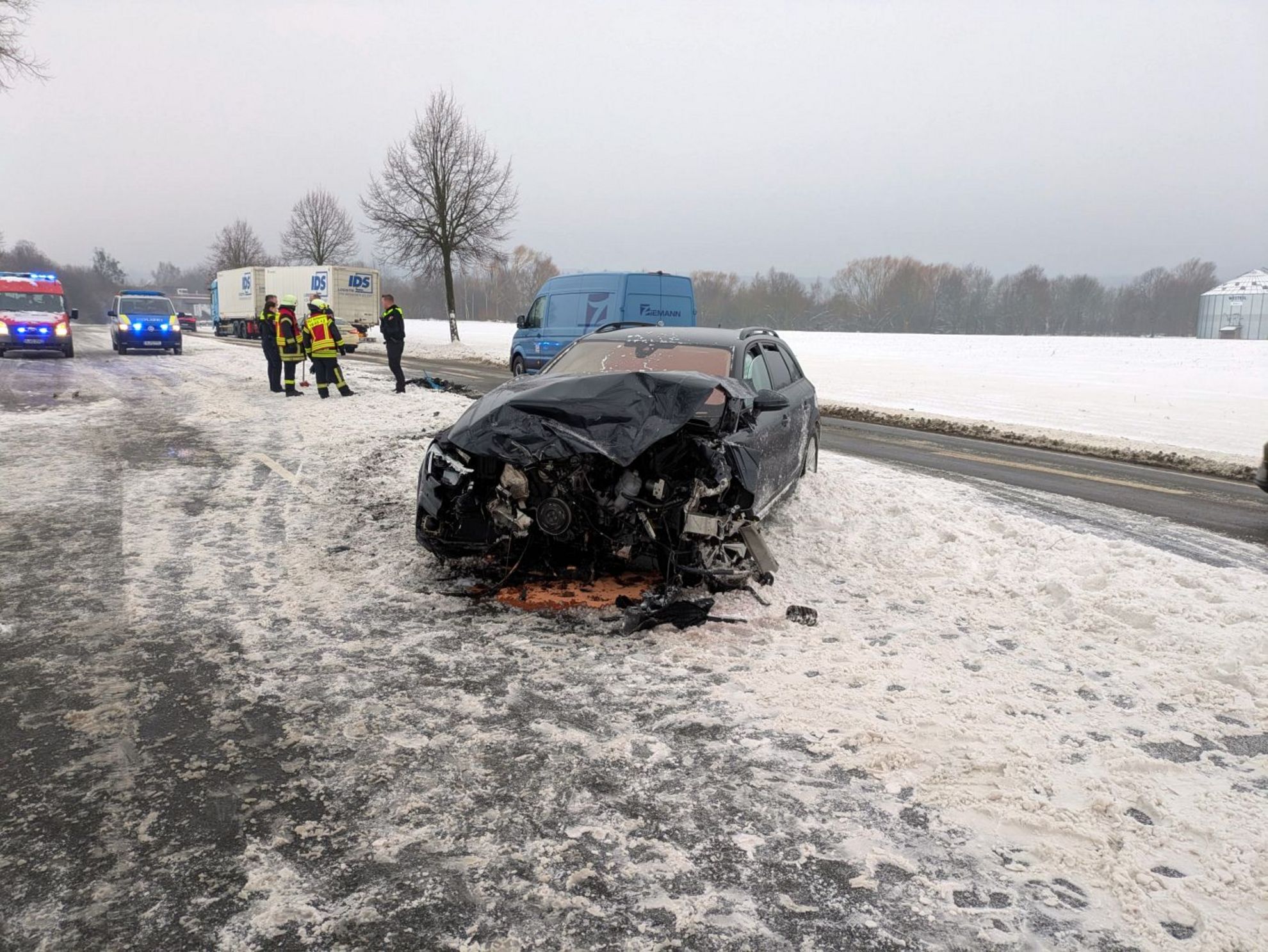 Kurz darauf, um 8.07 Uhr, erfolgte eine weitere Alarmierung für die Feuerwehren Holtensen und Bredenbeck. Gemeldet war ein Verkehrsunfall auf der B217 zwischen der Abfahrt Steinkrug und Holtensen. An der Einsatzstelle wurden auslaufende Betriebsstoffe aufgenommen, der Brandschutz sichergestellt sowie ein Batteriemanagement durchgeführt.