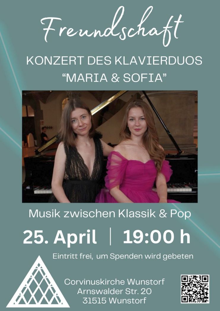Wunstorf. Zwei Musikerinnen, ein Thema: Freundschaft. Am Freitag, 25. April, um 19 Uhr ist das Klavierduo „Maria & Sofia“ in der Corvinuskirche zu Gast. Der Eintritt ist frei, um Spenden wird gebeten.
