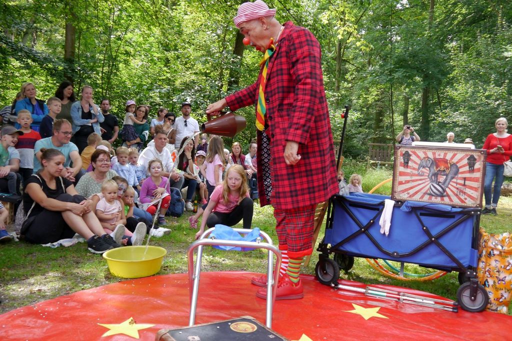 Springe. Einfach nur toll – so lautet das Fazit der Besucher, die mit ihren Mädchen und Jungen zum Kinderfest ins Wisentgehege gekommen sind. Besonderer Anziehungspunkt waren die beiden Vorstellungen von Clown Bernie, der die jungen Zuschauer mit in sein fröhliches Programm einbezog..