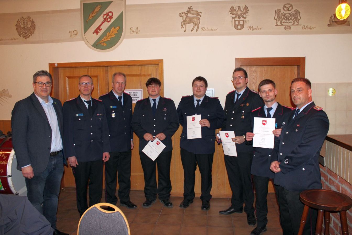 Während der Versammlung wurden außerdem Mitglieder geehrt, die ihre Auszeichnung noch nicht erhalten hatten. Die Hochwasser-Ehrennadel 2023 des Landes Niedersachsen ging an Yannik Bödecker, Jan Hendrik Liecker, Lennox Theesen und Aarik Will.