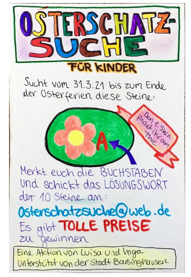 Die Osterschatzsuche richtet sich an Barsinghäuser Kinder und beginnt am Mittwoch, den 31. März und endet mit dem Ende der Osterferien am 11. April. Interessierte Kinder haben die Aufgabe im gesamten Stadtgebiet Ausschau nach Steinen zu halten, die mit einer Blume verziert sind. Neben der Blume befinden sich auf den Steinen Buchstaben, die zu merken sind und weitere Hinweise, die dann zum nächsten Stein führen. Wichtig ist, dass kein Stein mitgenommen oder an einen anderen Platz gelegt werden darf, damit möglichst viele Kinder Vergnügen an der Osterschatzsuche haben.