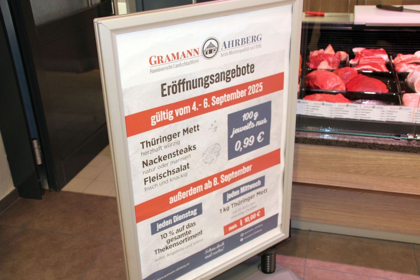 Die Fleischtheke übernimmt Gramann & Ahrberg. „Wir legen Wert auf höchste Qualität schon bei der Auswahl unserer Tiere“, betont Bastian Gramann. „Unsere Kunden in Bennigsen dürfen sich auf Meisterqualität freuen – und zur Eröffnung gibt es besondere Angebote.“ So gibt es bis auf Weiteres jeden Mittwoch 1 kg Thüringer Mett mit einer Metzgerzwiebel und 10 Brötchen für 10 Euro. Jeden Dienstag gibt es 10 Prozent auf das gesamte Thekensortiment. Bis zum 6. September bietet Gramann & Ahrberg weitere Aktionspreise.