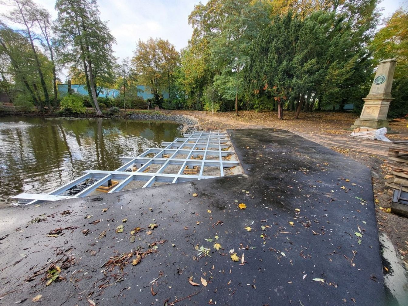 Zu den bisher umgesetzten Maßnahmen zählen der komplette Neubau des Gehweges, die Sanierung der Ufermauern, der Bau neuer Zugänge zum Teich sowie die Anfertigung der Stahlkonstruktion für den zukünftigen Hochzeitsbalkon. „Mit der Freigabe des Gehweges ist ein großer Fortschritt erzielt worden“, heißt es aus dem Rathaus. Der verbliebene Bauzaun wurde nun in das Ziegenteichgelände versetzt, sodass der öffentliche Bereich wieder weitgehend nutzbar ist.