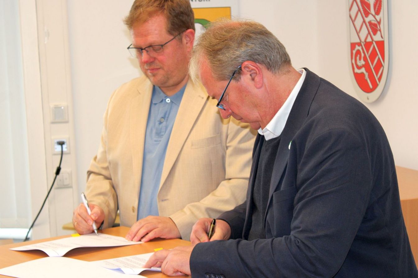 Die MOWI hat mit der cevendo GmbH einen neuen Veranstalter. Der Vertrag ist unterzeichnet und der Termin der Veranstaltung steht fest. Bürgermeister Henning Schünhof (2.v.l.) und Markus Hugo, Geschäftsführer cevendo GmbH, (2.v.r.), freuen sich mit Wirtschaftsförderer Timo Muchow (l.) und Anke Schiebusch (Planungsteam MOWI) auf die kommenden MOWIs.