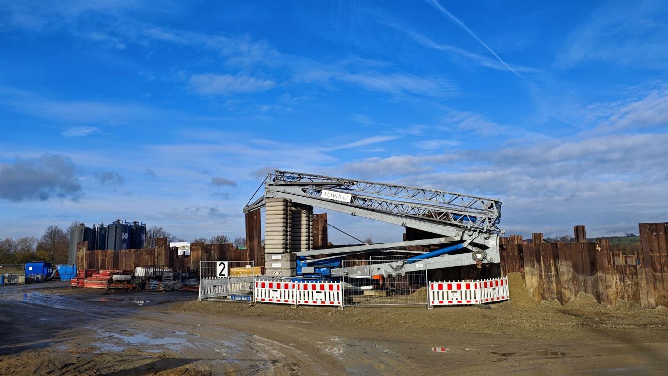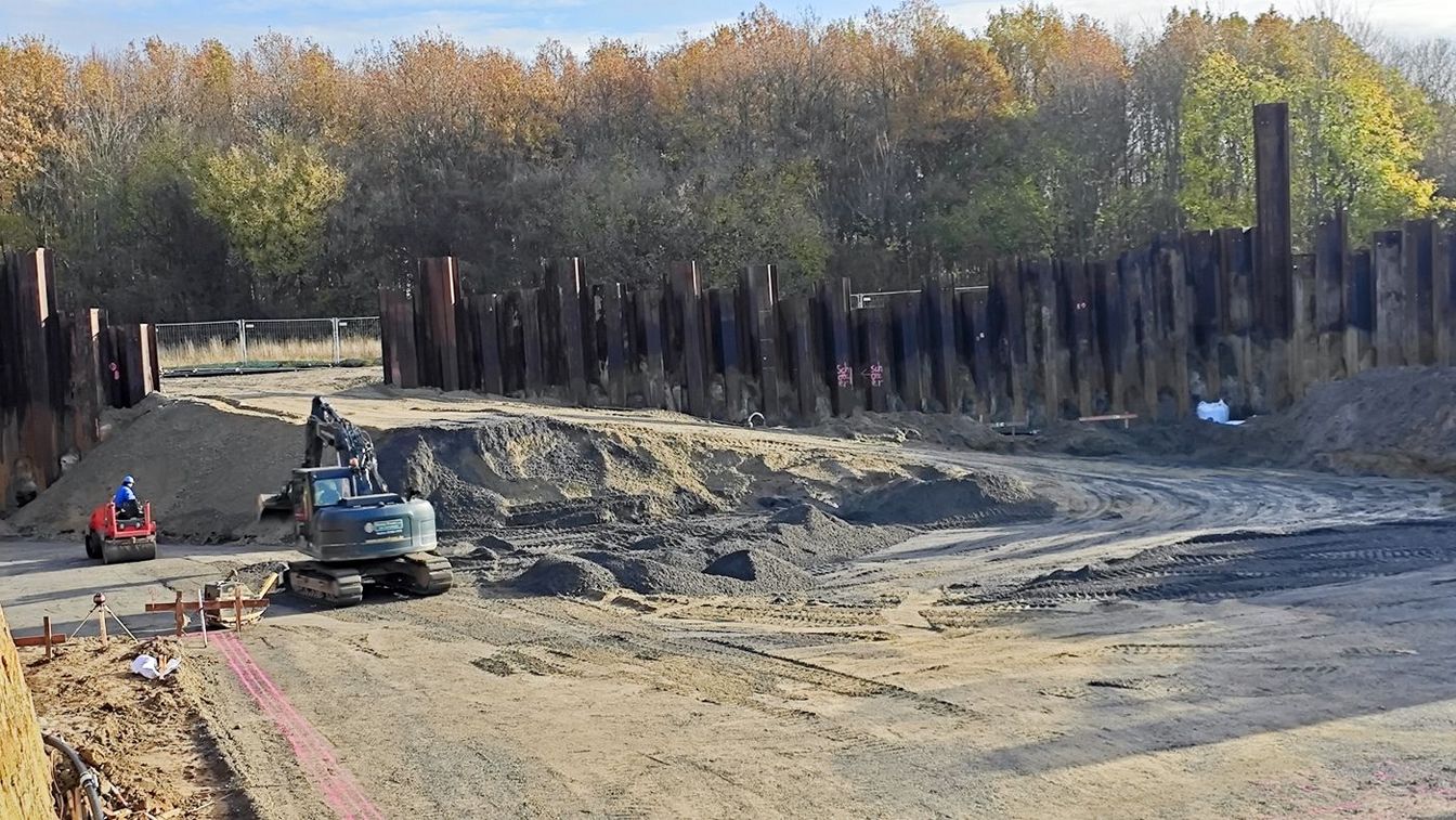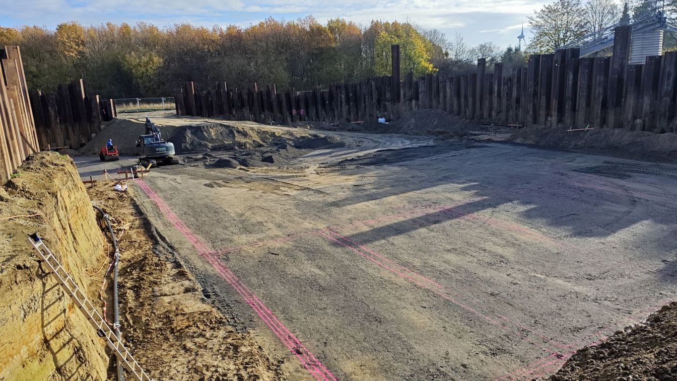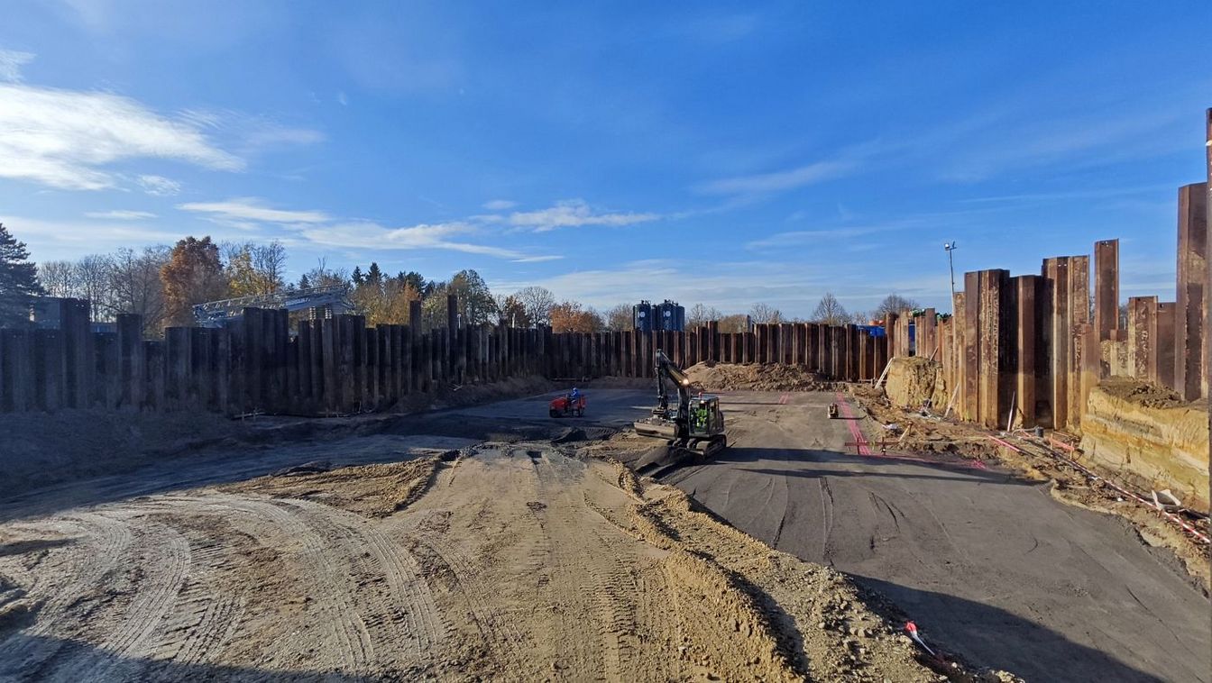 Die Vorbereitungen dazu sollen noch diese Woche beginnen, damit in der kommenden Woche die Arbeiten starten können. Pro Tag sollen dann 15 Pfähle errichtet werden. Zunächst auf der einen Seite der Baugrube, dann wird die aufgeschüttete Rampe auf der anderen Seite der Baugrube erreichtet und die Fahrzeuge arbeiten sich erneut von der Mitte bis an den Rand. Außerdem soll eine ein Meter starke Schotterschicht für die Bodenplatte aufgeschüttet werden.