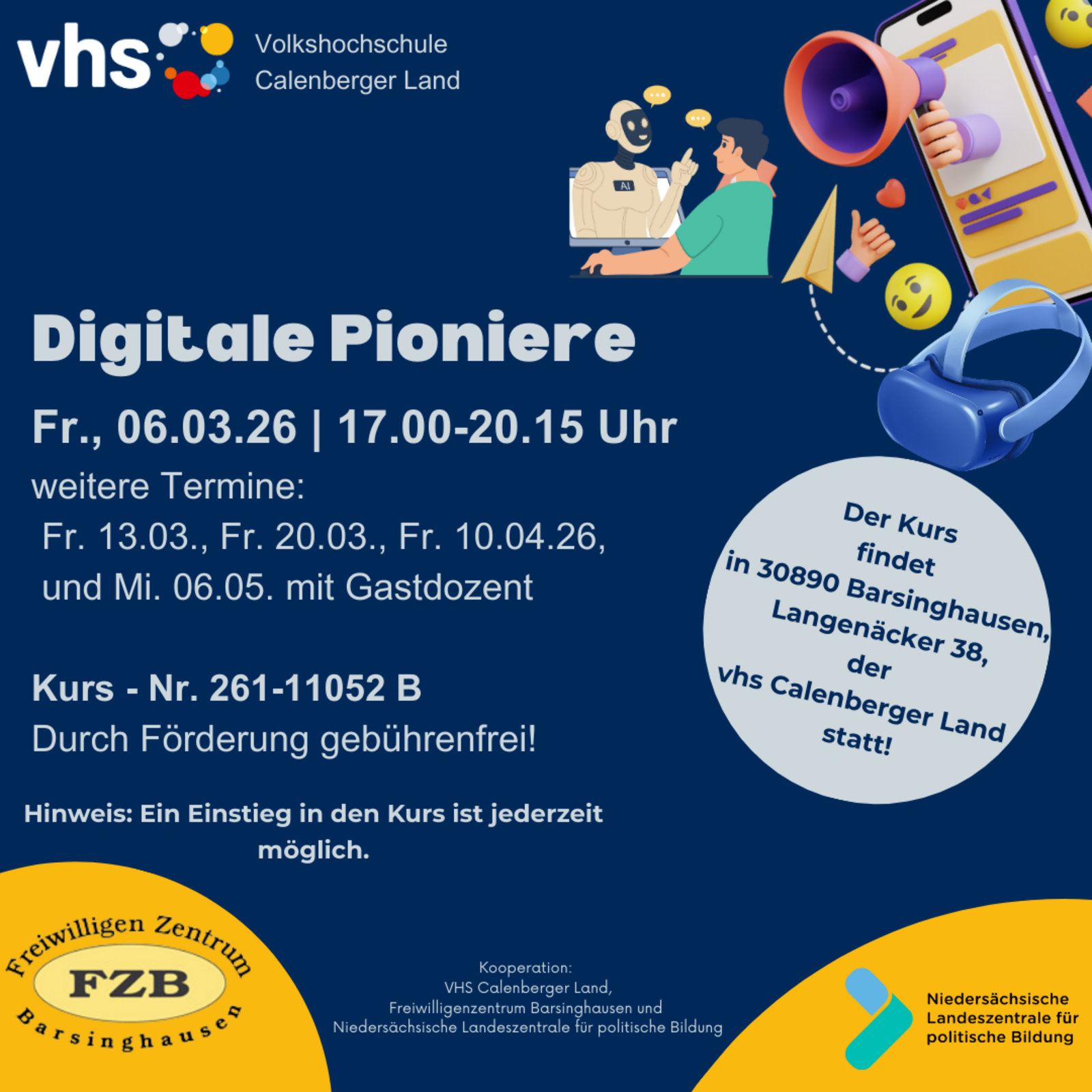 Der Kurs wird von zwei erfahrenen Kursleitungen (Moderation & Technik) begleitet und findet in Kooperation mit dem Freiwilligen-Zentrum Barsinghausen sowie der Niedersächsische Landeszentrale für politische Bildung statt. Die Teilnahme ist offen und flexibel: Es handelt sich nicht um einen geschlossenen Kurs – einzelne Termine können unabhängig voneinander besucht werden.